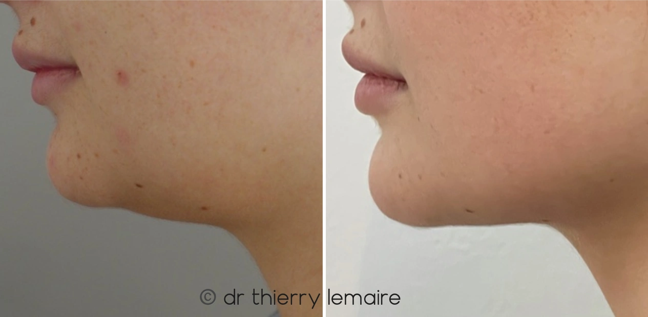 Chez cette jeune patiente l’excédent graisseux était peu important mais la transition entre le visage et le cou n’était pas nette. La lipoaspiration de quelques ml de graisse a permis de supprimer le double-menton et de redessiner l'ovale du visage.