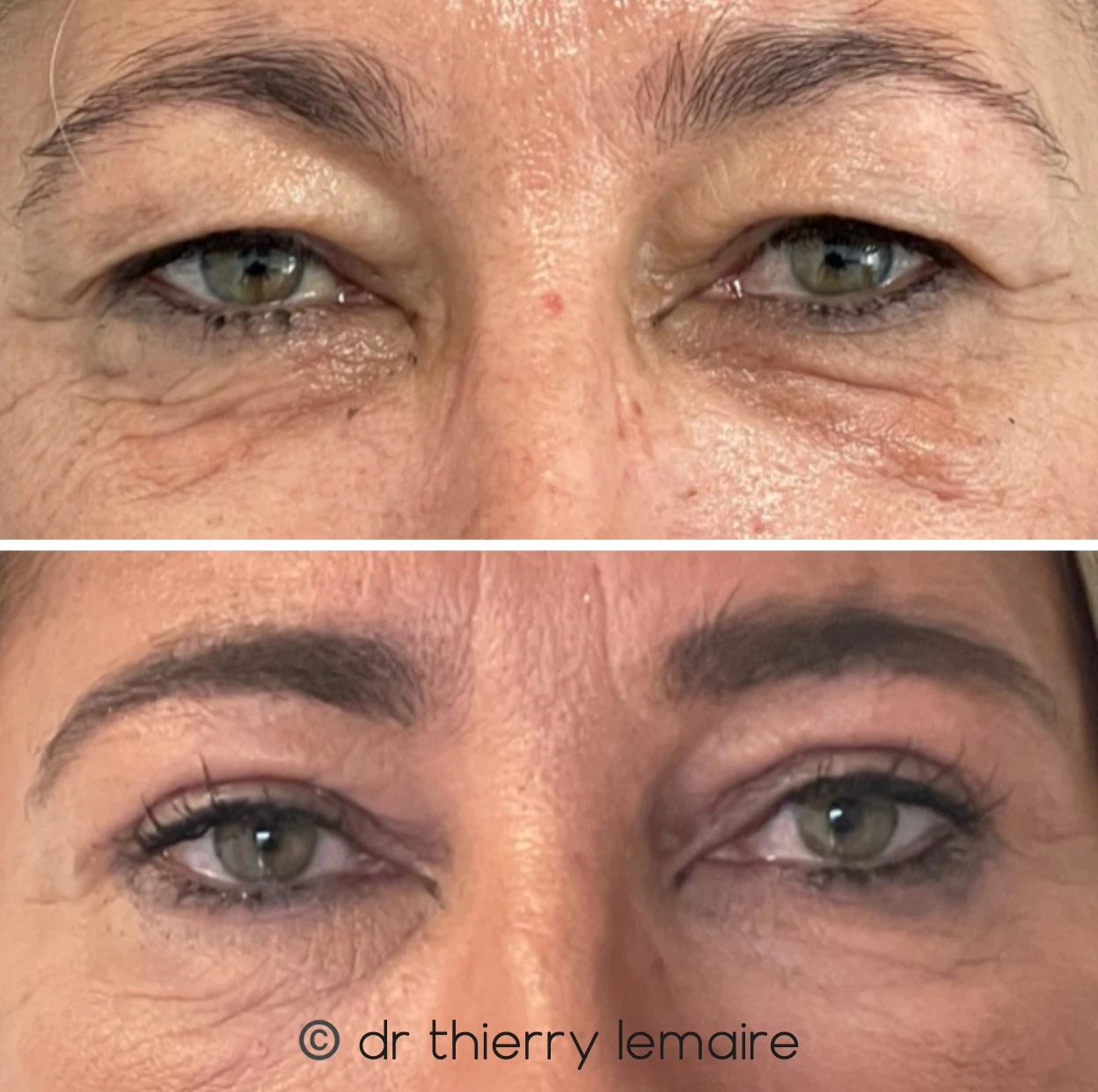 L’injection, sous anesthésie locale, d’1 ml de graisse a permis de combler la zone « creuse » et sombre située sous les poches . La zone d’ombre créée par les poches graisseuses a ainsi été effacée. Les poches ont disparu sans avoir été enlevées. En procédant de cette manière on évite le risque d’avoir un oeil légèrement creux. D’autre part les suites opératoires sont généralement plus rapides que celles d’une blépharoplastie.